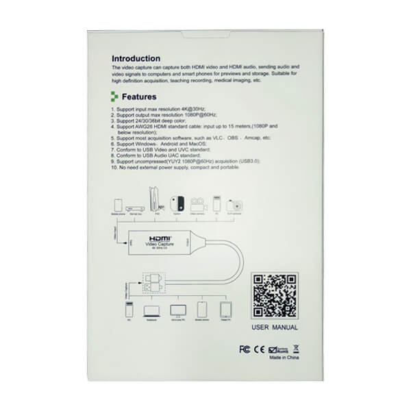 این کارت کپچر قادر است ورودی HDMI با رزولوشن 4K@30Hz را دریافت کند و خروجی را به صورت Full HD 1080P@60Hz ارائه دهد. این ویژگی باعث می شود تصاویر ضبط شده بسیار واضح و بدون افت کیفیت باشند، حتی هنگام انتقال به کامپیوتر یا لپ تاپ. - سازگاری گسترده با سیستم عامل ها و نرم افزار ها