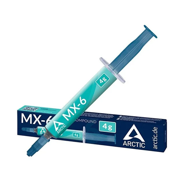 خمیر سیلیکون Arctic MX-6 دارای آخرین تکنولوژی ساخت خمیر حرارتی است و مادهای است که رابط انتقال حرارت از روی چیپ به روی هیت سینک میباشد. این مدل برای سیستمهای حرفهای، چیپ کارت گرافیک، تعمیرات موبایل، اورکلاک و نیز پردازشگرهای سرور و ورک استیشن به کار میرود. این رسانای گرمایی بین دو قطعه فلزی مورد استفاده قرار میگیرد که معمولاً این دو قطعه پردازنده و سیستم خنک کننده یا هیتسینک هستند. توسط این خمیر گرما میان پردازنده و هیتسینک جابجا شده و باعث کارکرد بهتر پردازنده میشود.