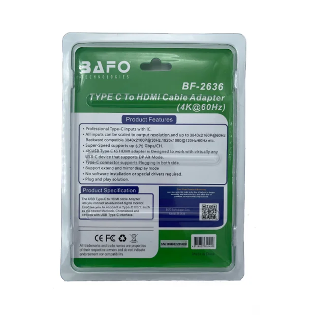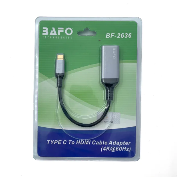 تبدیل Type-C به HDMI بافو مدل BF-2636 یک مبدل با کیفیت و مقرون به صرفه است که به شما امکان می دهد دستگاه های دارای پورت Type-C را به نمایشگرهای دارای کابل HDMI متصل کنید. این آداپتور از رزولوشن 4K@60Hz پشتیبانی می کند و می تواند تصاویر با کیفیت بالا را ارائه دهد. توجه داشته باشید که رابط تایپ سی male و پورت HDMI به صورت Female میباشد. ویژگیهای اصلی این محصول عبارتند از:
