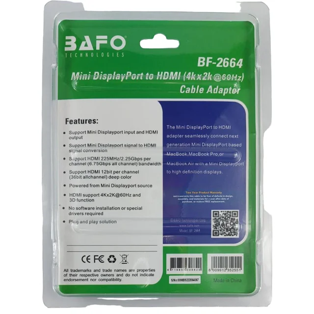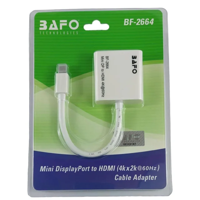 تبدیل مینی دیسپلی به HDMI بافو مدل BF-2664 محصول با کیفیتی در این زمینه است که به راحتی میتوانید در انواع محیطهای خانگی و اداری از آن استفاده کنید. پوشش تبدیل مینی دیسپلی به HDMI بافو مدل BF-2664 از جنس PVC بوده و کابل آن حدود ده سانت طول دارد. این تبدیل قابلیت پشتیبانی از رزولوشنهای Full HD و 4K را دارد. تبدیل مینی دیسپلی به HDMI بافو مدل BF-2664 جهت اتصال دستگاههایی که به ورودی مینی دیسپلی مجهز هستند به دیگر دستگاه دارای پورت HDMI استفاده میشود.