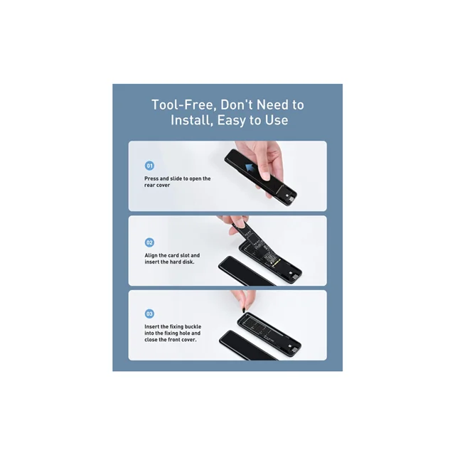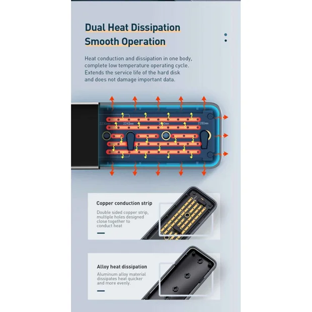 باکس درایو اس اس دی Baseus با SSD های M2 “دو شیار” سازگار می باشد. ابعاد اس اس دی های قابل پشتیبانی عبارتند از: 22×80 ,22×60 ,22×42 ,22×30. همچنین نوع پورت های B Key و M+B Key را نیز پشتیبانی می کند.