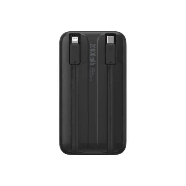 این پاوربانک دارای چهار خروجی شامل دو کابل متصل (Type-C و Lightning) و دو درگاه (USB-A و USB-C) است. چنین ترکیبی باعث میشود بتوانید چند دستگاه را به صورت همزمان شارژ کنید. برای مثال میتوانید گوشی، تبلت و هدفون بیسیم خود را به طور همزمان به پاوربانک متصل کنید و بدون نگرانی از آن استفاده کنید.