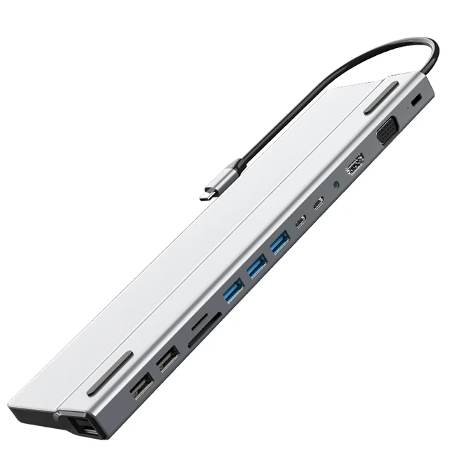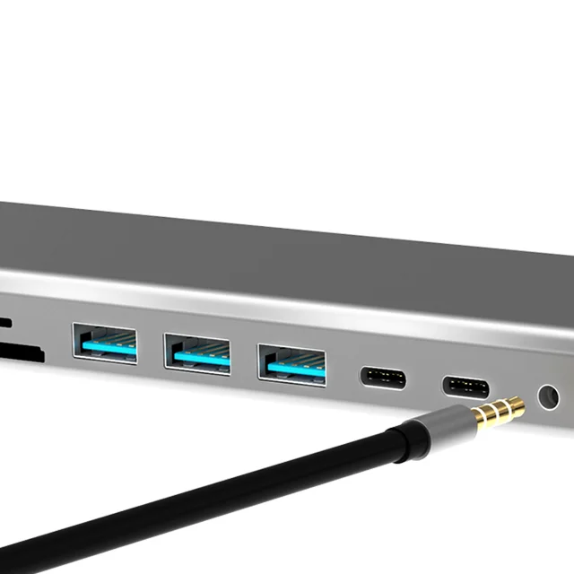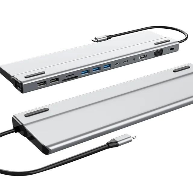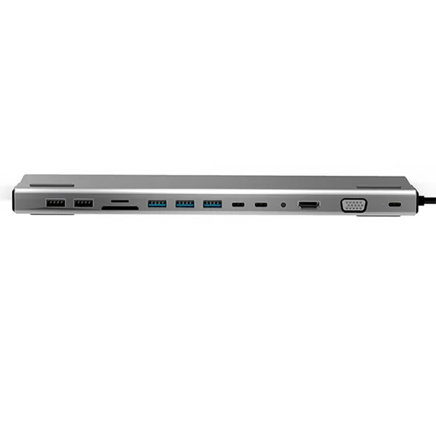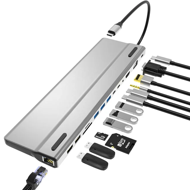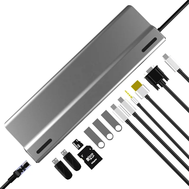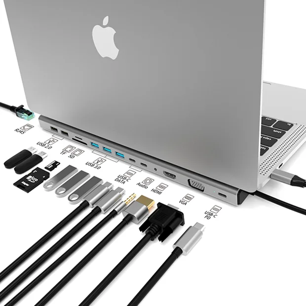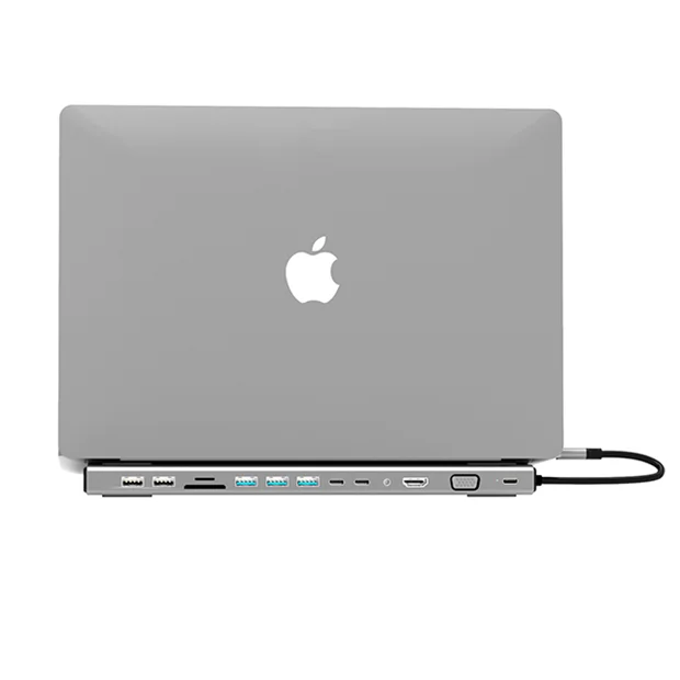 دارای 14 درگاه    |    تبدیل یک درگاه USB-C به  HDMI , VGA , USB-C , USB 3.0 , USB 2.0 , RJ45 , SD & TF Card , 3.5mm Audio   |    دارای قابلیت PowerDelivery    |    بدنه با کیفیت آلومینیومی   |    با ساختار مناسب برای استفاده به عنوان پایه لپتاپ    |    سازگار با دستگاه های دارای درگاه Thunderbolt