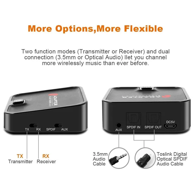 اتصال صوتی دیجیتال نوری Toslink And 3.5: گیرنده فرستنده بلوتوث هر دو ورودی/خروجی 3.5 میلی متری (AUX و RCA) و دیجیتال نوری TOSLINK را برای بیشترین سازگاری با تلویزیون های قدیمی و جدید و همچنین هر دستگاه دیگری با نوری (TOSLINK/SPDIF) ارائه می دهد. (رایانه های خروجی صدای استریو RCA یا 3.5 میلی متر، جداول، جعبه های پخش دیجیتال و غیره.