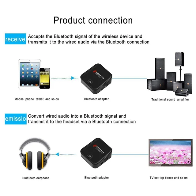 فرستنده بلوتوث می تواند به شما اجازه دهد در دنیای موسیقی لذت ببرید. سیگنال صوتی آنالوگ را ارائه می دهد یا سیگنال صوتی تلویزیون دیجیتال را از طریق حالت بلوتوث به بلندگوی بلوتوث، هدست بلوتوث یا هدفون بلوتوث ارسال می کند.