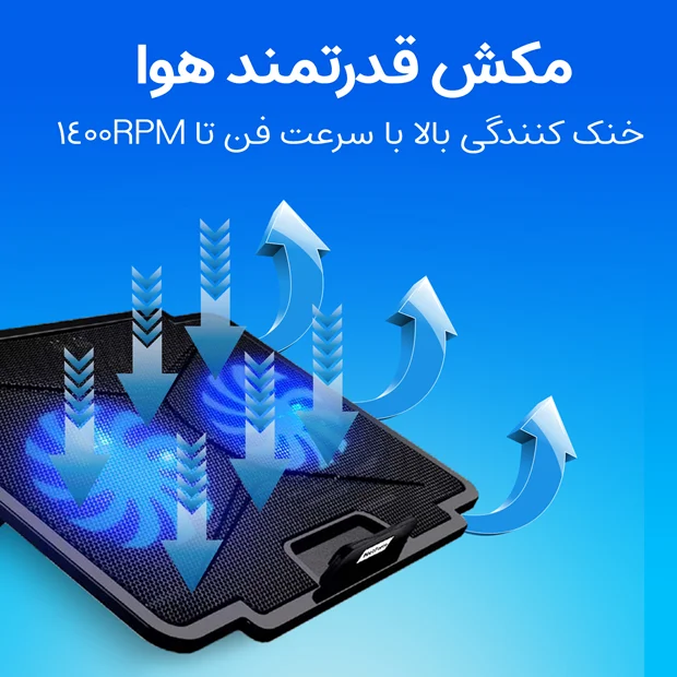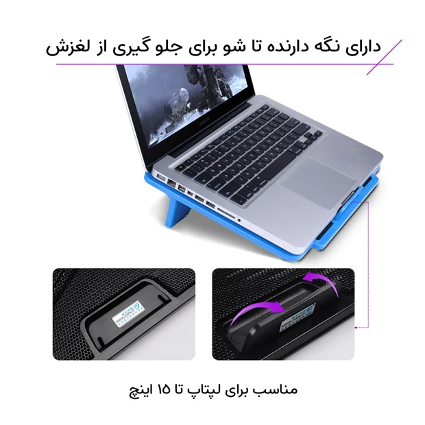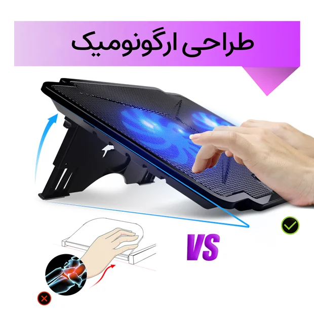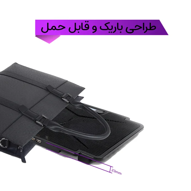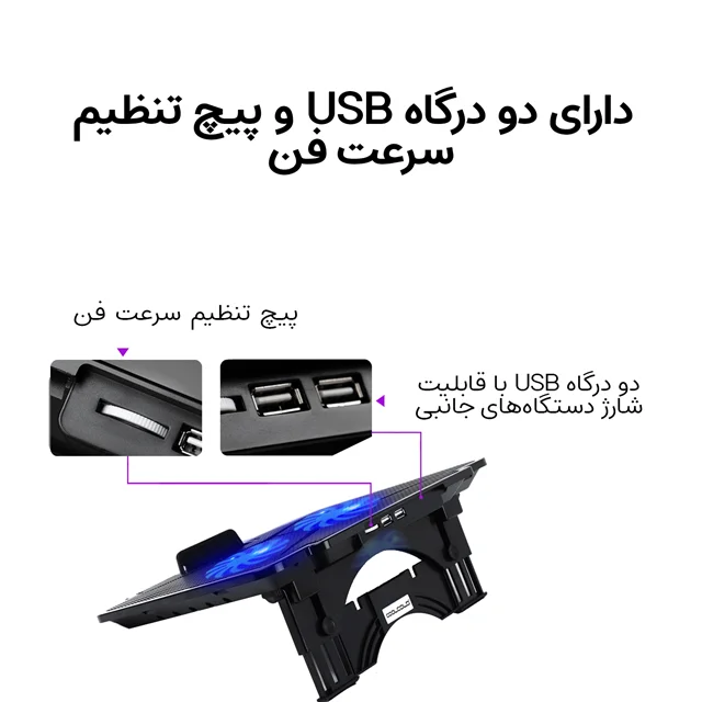 طراحی جمع و جور ، قابل حمل. خنک کنندگی موثر لپتاپ. پایه های قابل تنظیم ارتفاع و زاویه با توجه به نیاز کاربر. فن خنک کننده با قدرت مکش هوای بالا به سمت پایین و طراحی بی صدا دارای دو درگاه USB2.0 با قابلیت انتقال داده