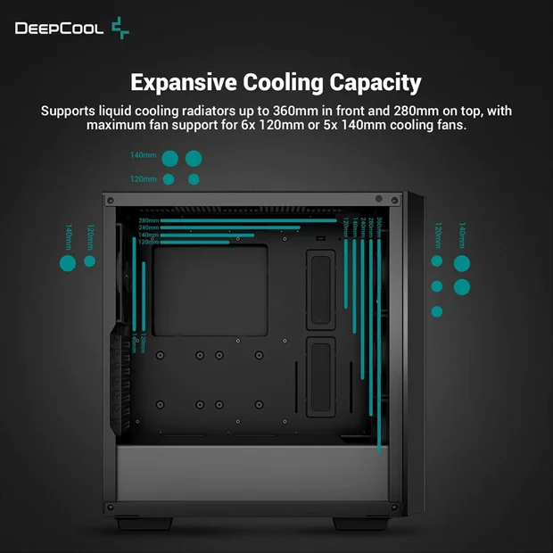 Front: 3×120 / 2×140mm Top: 2×120 / 2×140mm Rear: 1×120 / 1×140mm
