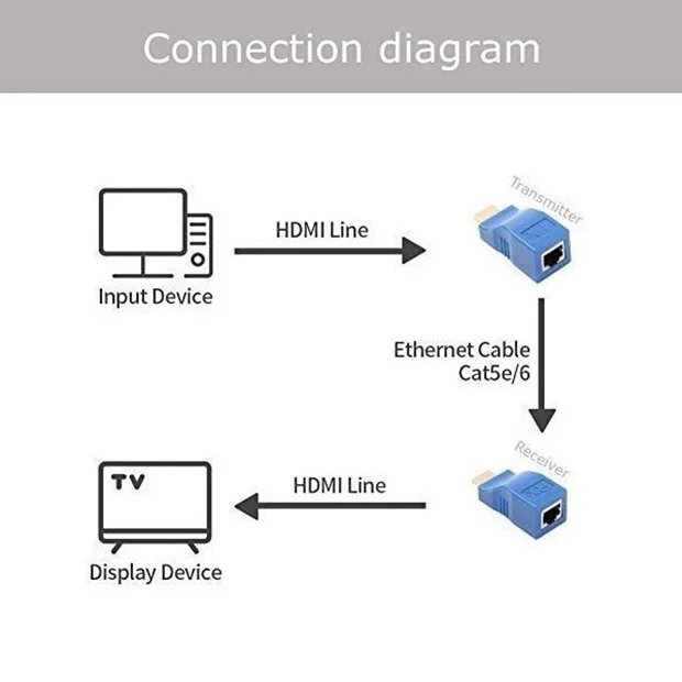 ابتدا از منبع اصلی یک سوکت HDMI به فرستنده متصل شده، سپس فرستنده با 1 کابل شبکه به گیرنده متصل شده و از آن با یک سوکت HDMI دیگر به نمایشگر وصل شده و صدا و تصویر از این طریق منتقل میشود.