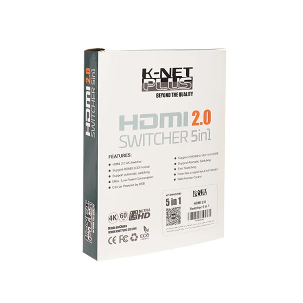 سوئیچ 5 پورت HDMI 2.0 کی نت پلاس مدل KP-SWHD2005 دستگاهی است که به شما امکان میدهد پنج دستگاه منبع HDMI را به یک نمایشگر HDMI متصل کنید. این سوئیچ از نسخه 2.0 HDMI پشتیبانی میکند و میتواند رزولوشن 4K با نرخ تازه سازی 60 هرتز را منتقل کند.
