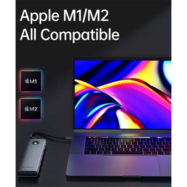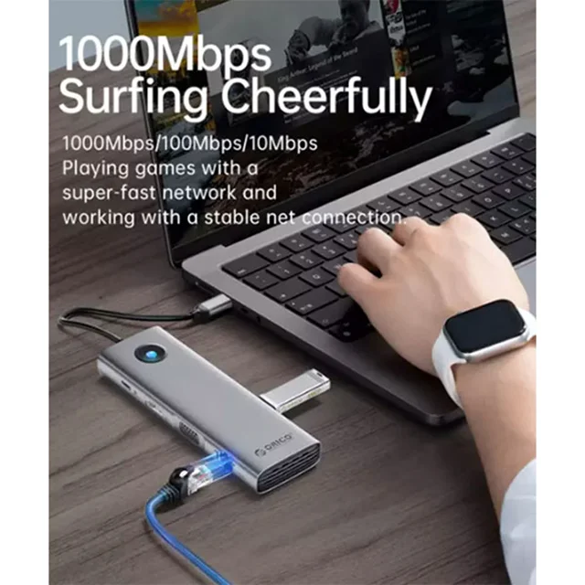 تعداد درگاه: 8 پورت | رابط: تایپ سی | نوع درگاهها: USB-A دو پورت (5Gbps) ، USB-A یک پورت (480MBps) ، USB-C یک پورت (5Gbps) ، یک پورت PD100W ، یک پورت HDMI (4K 60Hz) ، یک پورت VGA (1080P 60Hz) ، یک پورت Gigabit LAN