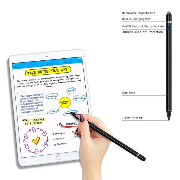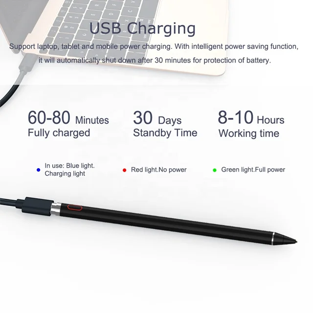 قلم اکتیو P2 یک وسیله جانبی کاملا ضروری برای نوت برداری، ترسیم و طراحی، و ابزاری کارآمد در کلاس ها و آزمون های آنلاین میباشد. بدنه و نوک این قلم از جنس فلز با کیفیت میباشد که صفحه نمایش دستگاه را در برابر خط و خش حفظ میکند. بر روی قسمت بالای این قلم کلید روشن و خاموش قلم قرار گرفته شده است که با فشردن آن LED سفید رنگ نشان دهنده فعال بودن قلم روشن میشود.