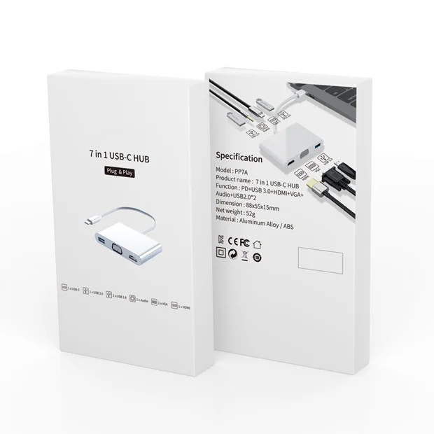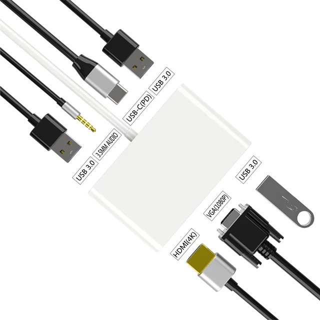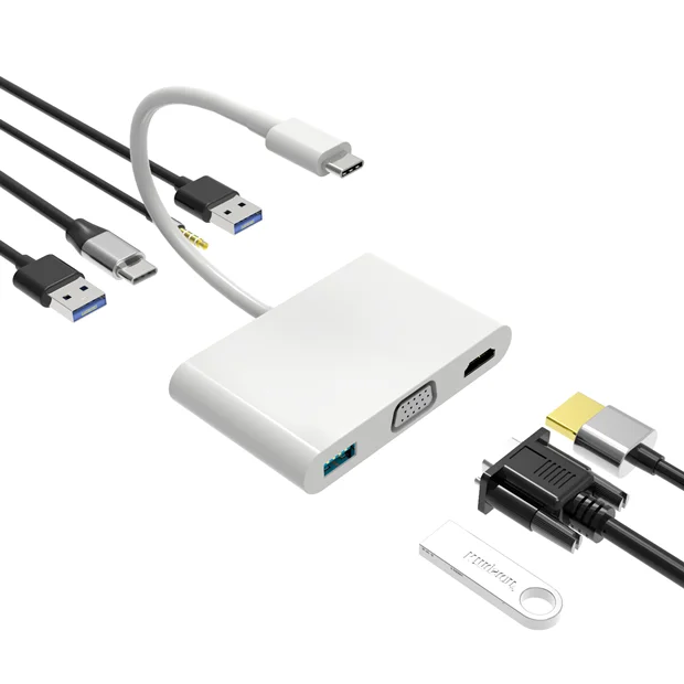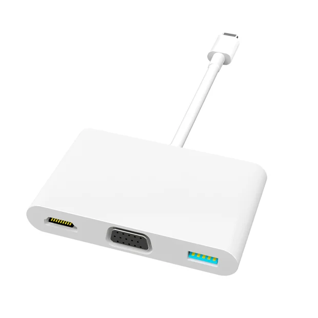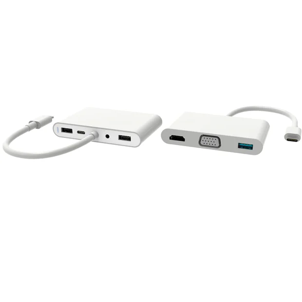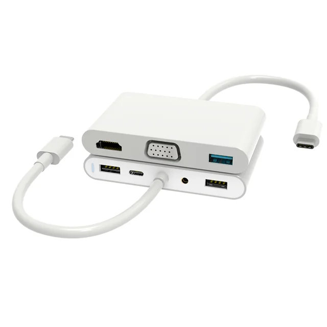 دارای 7 درگاه، تبدیل یک درگاه USB-C به HDMI , VGA , USB 2.0 , USB 3.0 , 3.5mm Audio و USB-C دارای قابلیت PowerDelivery بدنه با کیفیت با رنگ سفید اپل ابعاد جمع و جور با قابلیت جابجایی بالا سازگار با لپتاپ های دارای درگاه Thunderbolt