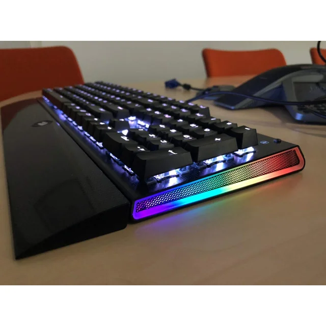 صفحه کلید با سیم مخصوص بازی ساختار آلومینیومی با کیفیت، مقاوم در برابر نفوذ آب 12 کلید مالتی مدیا با سوئیچ های آبی قابلیت Anti-Ghosting برای تمام کلید ها نور پس زمینه RGB با 6 تم مختلف و یا حالت 9 رنگ ثابت امکان غیر فعال کردن کلید WIN محل استراحت مچ عریض