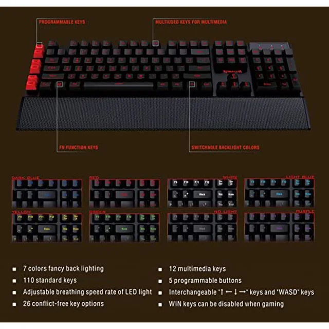 صفحه کلید با سیم مخصوص بازی کلید های چهار جهته و WASD قابل تغییر 12 کلید مالتی مدیا 5 ماکرو-کلید قابل برنامه ریزی قابلیت فشرده شدن 26 کلید بدون اختلال نور پس زمینه 7 رنگ امکان غیر فعال کردن کلید WIN کابل 180 سانتی متری و جنس بدنه ABS