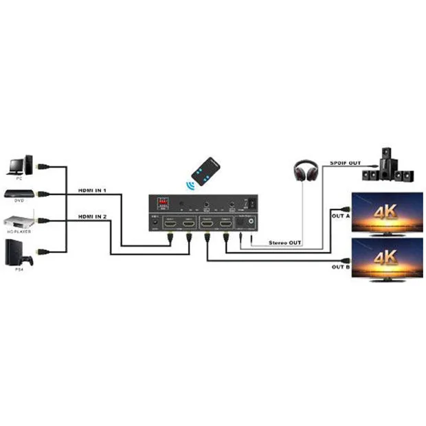 در ماتریکس 2 در 2 HDMI تی سی تی مدل TC-HMX-22 کاربر با استفاده از دکمه موجود در جلوی دستگاه و ریموت کنترل داخل بستهبندی به راحتی و حتی از فاصله دور میتواند منبع تصویر HDMI مورد نظر را از میان 2 ورودی انتخاب و در 2 دستگاه خروجی مشاهده کند. به عبارتی دیگر این دستگاه هم کار سوئیچر را انجام میدهد و امکان سوئیچ کردن بین دو ورودی را فراهم کرده و هم امکان تبدیل یک ورودی به دو خروجی یعنی کار یک اسپلیتر را فراهم کرده است.