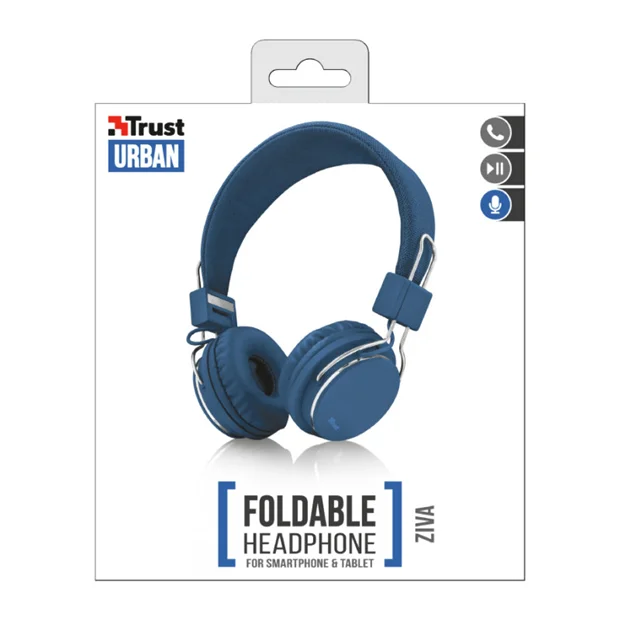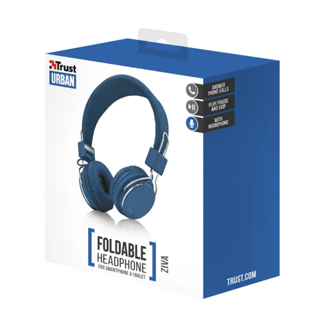 Ziva Foldable Blue Wired trust Headphone یکی از هدفون های دو گوشی است که روی گوش کاربر قرار می گیرد. این محصولل از اتصال کابلی برخوردار است و استایل کابل آن گرد است. کابل دارای طول ۱۱۰ سانتیمتر است و از کاتکتور ۳.۵ میلیمتری برخوردار است. اسن محصول که با وزن ۱۵۲ گرم تولید شده است کیفیت صدای استریو را فراهم می آورد. امپدانس ۳۲ اهم؛ کانال صوتی ۲.۰؛ فرکانس پاسخگویی ۲۰ هرتز تا ۲۰۰۰۰ هرتز از مشخصات دیگر این محصول می باشد.