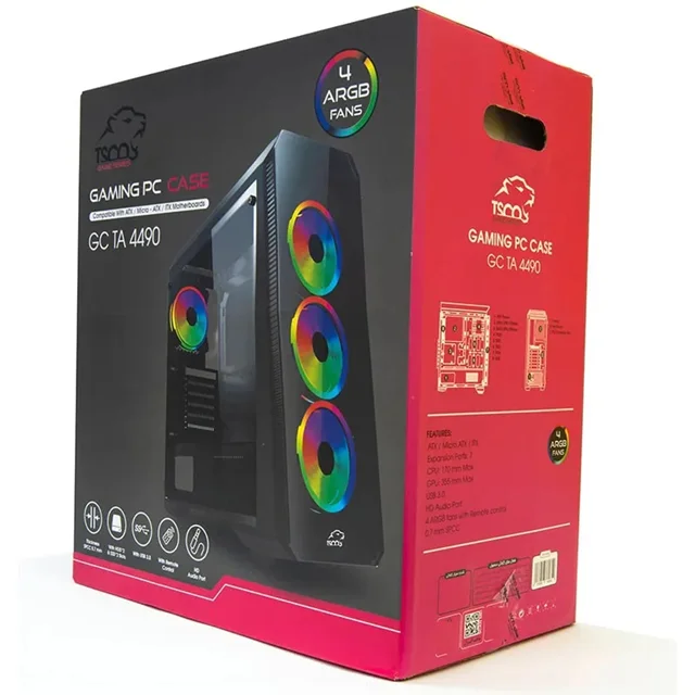 GC TA 4490 جدید ترین کیس از برند TSCO است که هر آنچه از یک کیس گیمینگ جذاب و باکیفیت انتظار دارید در این کیس گنجانده شده است.GC TA 4490 با برخورداری از نورپردازی فوق العاده چشم نواز به واسطه 4 عدد فن ARGB نصب شده بر روی کیس با قابلیت تغییر رنگ با استفاده از ریموت کنترل ظاهر زیبا با پنل کناری ساخته شده از جنس شیشه ی مقاوم در برابر ضربه و حرارت با قابلیت نمایش تمامی تجهیزات داخل کیس میتواند نظر شما را به خود جلب کند.