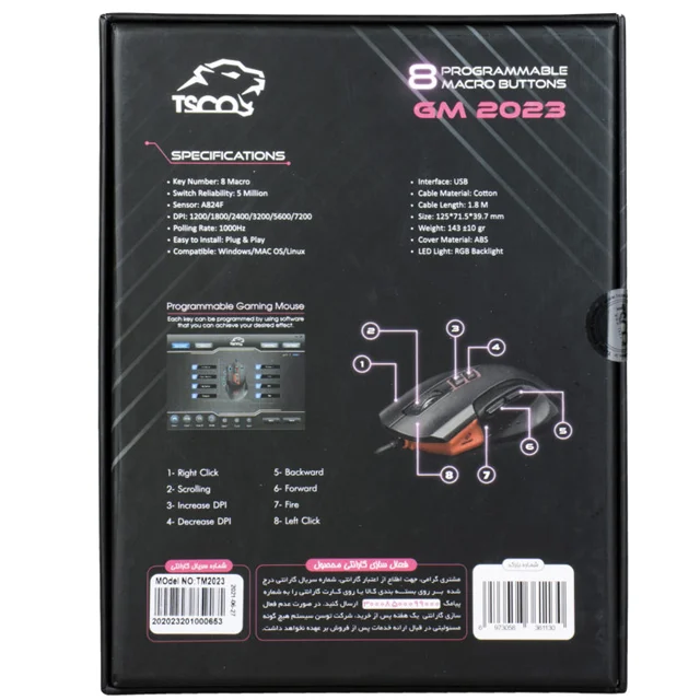 همچنین 6 رده دقت حسگر قابل تنظیم این ماوس گیمینگ، به کاربر امکان تنظیم دقت بر اساس موقعیت را می دهد. چراغ LED نیز از دیگر نکات قابل توجه در ظاهر این ماوس است. حسگر نوری بکار رفته در ماوس گیمینگ تسکو (TSCO) مدل GM 2023، امکان استفاده بر سطوح مختلف را فراهم می کند تا کاربر بدون محدودیت از بازی خود لذت ببرد.