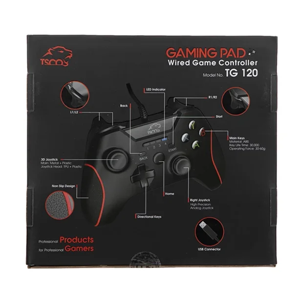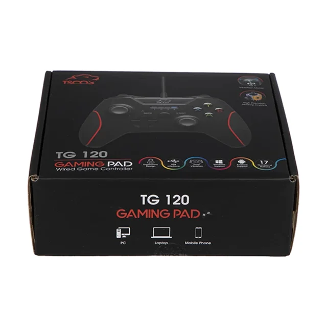 TG 120 تسکو با موتورهای لرزشی پیشرفته خود و انتقال ارتعاشات و لرزشهای بازی به دست بازیکن تجربهای واقعگرایانهتر خلق میکند و بازیکن میتواند لذتی بیشتر از بازی ببرد. با قابلیت شوک دوطرفه، این گیم پد حس هیجان و واقعیت مجازی بازی را تبدیل به یک تجربه واقعی و نفسگیر میکند. این گیم پد سیمی، اتصالی مستقیم و پایدار به گیمر ارائه میدهد. با وجود محبوبیت بالای اتصالات بیسیم، اتصالات سیمی همچنان قدرت و پایداری بیشتری دارند. اتصال سیمی میتواند سرعت انتقال داده را به طرز چشمگیری بالا ببرد. اتصال سیمی TG 120 با یک کابل 1.8 متری و یک رابط USB تایپ A ممکن شده است. گیم پد حرفهای تسکو با انواع مختلف پلتفرمهای بازی از جمله ps3، pc و اندروید سازگاری دارد و به شما اجازه میدهد در هر محیطی از بازی لذت ببرید.