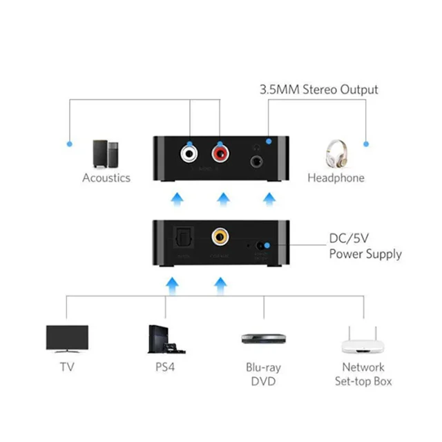 - تبدیل سیگنال دیجیتال کواکسیال یا toslink به سیگنال صوتی آنالوگ RCA L/R و صدای 3.5 میلی متری