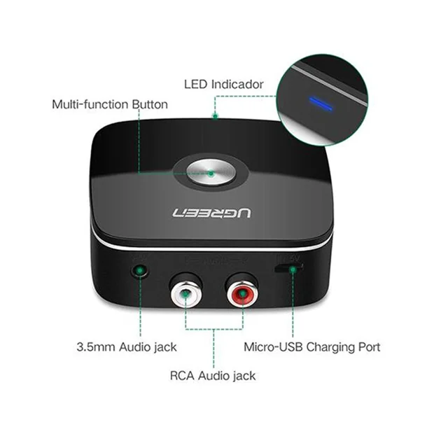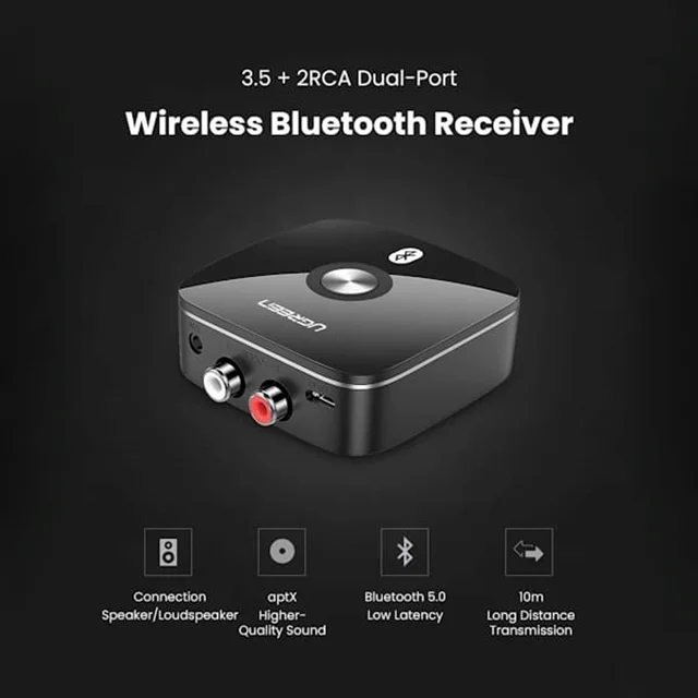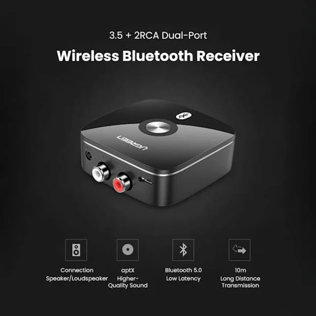 - آداپتور بلوتوث صوتی Ugreen CM106 دارای تراشه بلوتوث نسخه 5.0 است که یک سیگنال با کیفیت بالا تا فاصله 10 متر را ارائه می دهد. این گیرنده بلوتوث می تواند به هر گیرنده A/V و هر بلندگوی مجهز به جک استاندارد 3.5 میلی متری یا پورت RCA متصل شود و سازگاری ایده آلی را برای سینمای خانگی، سیستم های استریو و استریو ماشین و همچنین برای iPhone، iPad، iPod Touch، گوشی های هوشمند و دستگاه های اندرویدی فراهم کند.