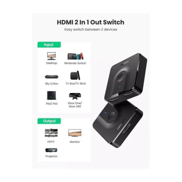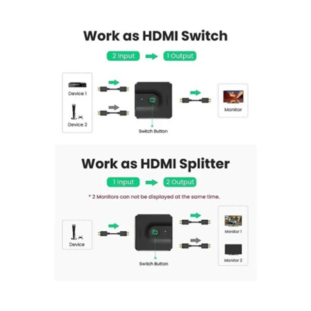 - سوئیچ اسپلیتر 2 طرفه HDMI یوگرین 50966 CM217، یک سوئیچر HDMI دو طرفه است که می تواند 2 منبع HDMI را به 1 صفحه نمایش HDMI وصل کند یا 2 صفحه نمایش HDMI را به 1 منبع HDMI متصل کند. (2 خروجی 1 ورودی یا 2 ورودی 1 خروجی). توجه: دو نمایشگر نمی توانند همزمان کار کنند. در حالت اسپلیتر، تنها 1 نمایشگر از 2 نمایشگر در یک زمان کار می کند.