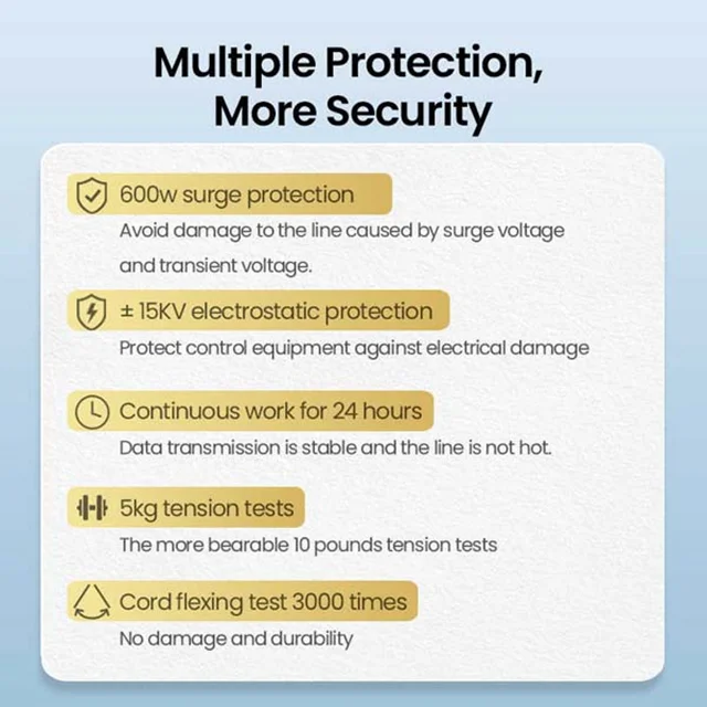 این کابل دارای حفاظت در برابر پالسهای زیاد (Surge Protection) با ظرفیت 600 وات است که از دستگاهها در برابر آسیبهای ناشی از نوسانات برق محافظت میکند. - سازگاری: