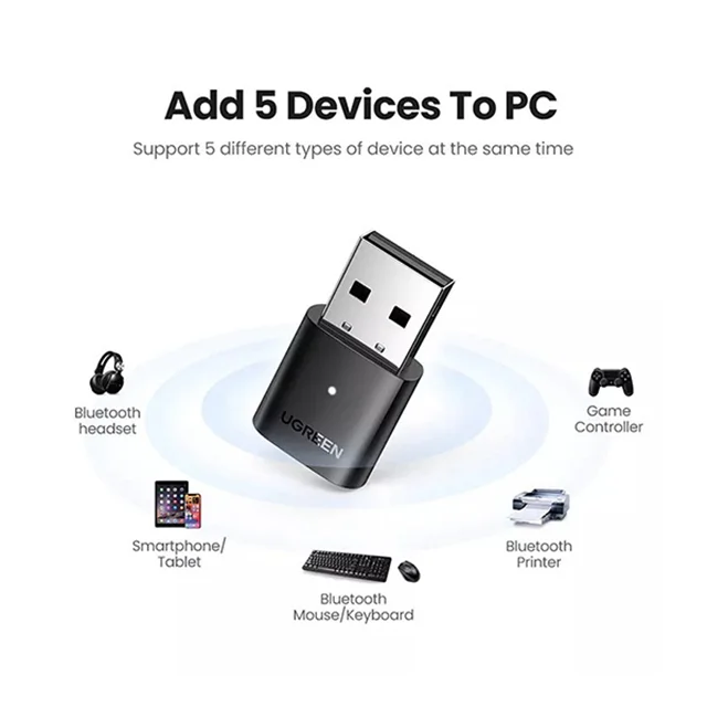لطفا توجه داشته باشید دانگل بلوتوث یوگرین CM390 فقط با Windows 11, 10, 8.1, 8, 7 – XP – Vista سازگار است. این دانگل بلوتوث فقط میتواند به رایانه رومیزی یا لپتاپ شما وصل شود و به دلیل اینکه چیپست این دستگاه Realtek RTL8761BUV بوده و نیاز به درایورهای لازم برای پشتیبانی از آن میباشد، نمیتوان از آن در دستگاههای دیگر مانند اتومبیل، تلویزیونها، تجهیزات سینمای خانگی و استریو دارای درگاه USB هستند استفاده کرد. همچنین با دستگاههایی مانند ویندوز 8، سیستم عامل مک، لینوکس، رادیو ماشین، تلویزیون سازگار نیست. دانگل بلوتوث CM390 به شما امکان میدهد تا حداکثر 5 دستگاه را به طور همزمان بدون تداخل با یکدیگر متصل کنید.