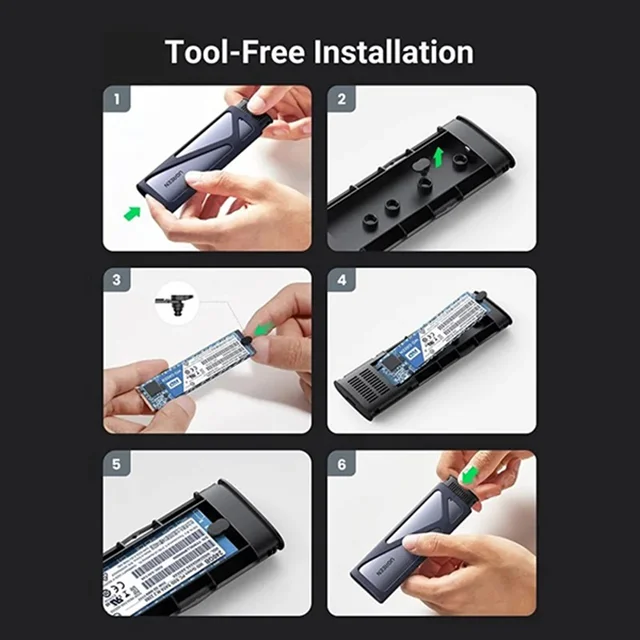 نحوه نصب SSD در قاب هارد یوگرین بسیار ساده است. درپوش یا بدنه قاب را با دقت جدا کنید. گیره ایمنی (ضامن) را به سمت بیرون بکشید. SSD را در اسلات M.2 قرار دهید. شکاف کلید SSD با اسلات باید تراز باشد. گیره را به جای اول برگردانید تا SSD ثابت شود. درپوش را مجدداً ببندید و پیچ ها (در صورت وجود) را محکم کنید.
