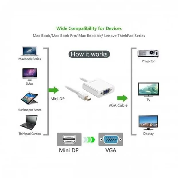 - قابلیت اتصال: این مبدلها امکان اتصال دستگاههای جدیدتر با کانکتور Mini DisplayPort به نمایشگرها و پروژکتورهای قدیمیتر با کانکتور VGA را فراهم میکنند.