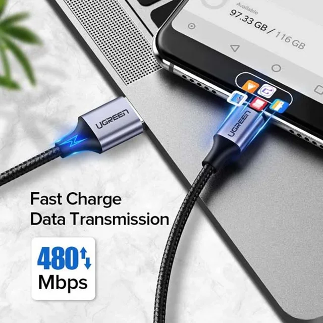 - کابل Type C یوگرین US288 سرعت انتقال اطلاعات تا 480 مگابیت در ثانیه را ارائه میدهد. این کابل برای پشتیبانی از شارژ سریع QC 3.0 طراحی شده است و میتواند در سریعترین زمان ممکن انواع گوشیها و لپ تاپها را شارژ کند.