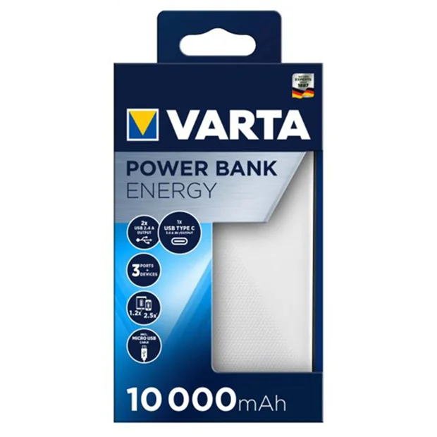 پاوربانک وارتا Fast Energy 10000 ساخت کشور آلمان یکی از سه پاور بانک فست شارژ وارتا است که با ظرفیت 10000 میلی آمپر ساعت دارای کاربردهای متنوع بوده و پاسخگوی بسیاری از نیازهای روزمره کاربران می باشد. این پاور بانک از تجهیزات هوشمند پشتیبانی می کند و در مقایسه با مدل های متداول به میزان 20 درصد سرعت شارژ بیشتری دارد. فناوری های ایمنی پیشرفته و محفظه آلومینیومی منحصر به فرد، پاوربانک های فست شارژ وارتا را به منبع انرژی عالی برای تقویت حداکثر انعطافپذیری و آزادی عمل تبدیل میکنند. پاور بانک دارای ابعاد 72.5×135.5×14.5 میلی متر و وزن 244 گرمی است.