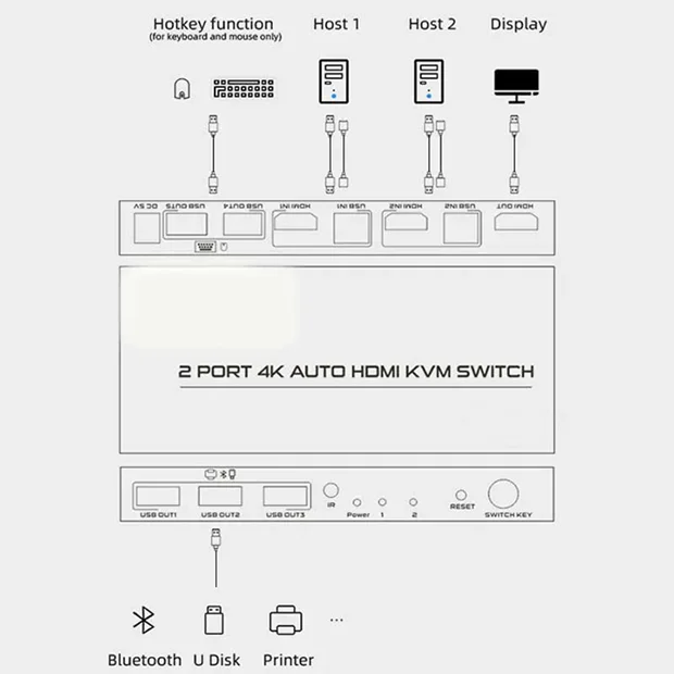 معمولاً کارشناس های کامپیوتر از سوئیچ KVM برای سوئیچ کردن (جابجایی ) از یک کامپیوتر یا سرور به کامپیوتر یا سرور دیگر استفاده می کنند. توسط KVM HDMI اتوماتیک 2 پورت می توان همزمان از دو دستگاه کامپیوتر و یا لپ تاپ و یا دستگاه DVR و یا NVR با یک نمایشگر و یک کیبورد و یک موس استفاده کرد. این دستگاه از نوع اتوماتیک بوده و توسط Hotkey کیبورد و بدون نیاز به سوییچ دستی بین دستگاه ها تعویض تصویر انجام می شود. KVM HDMI اتوماتیک 2 پورت از رزولوشن تصویر 3840*2160 / 30Hz و انواع سیستم عامل ها پشتیبانی می کند.